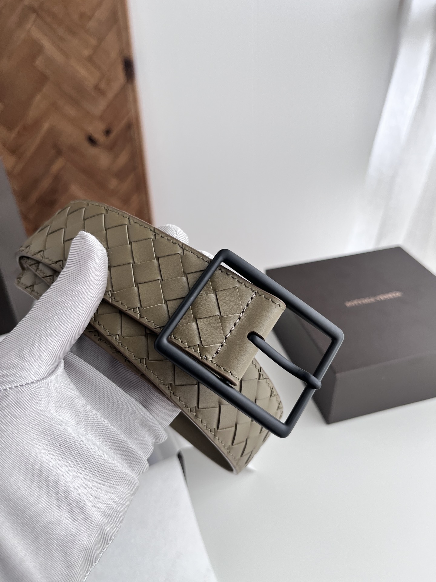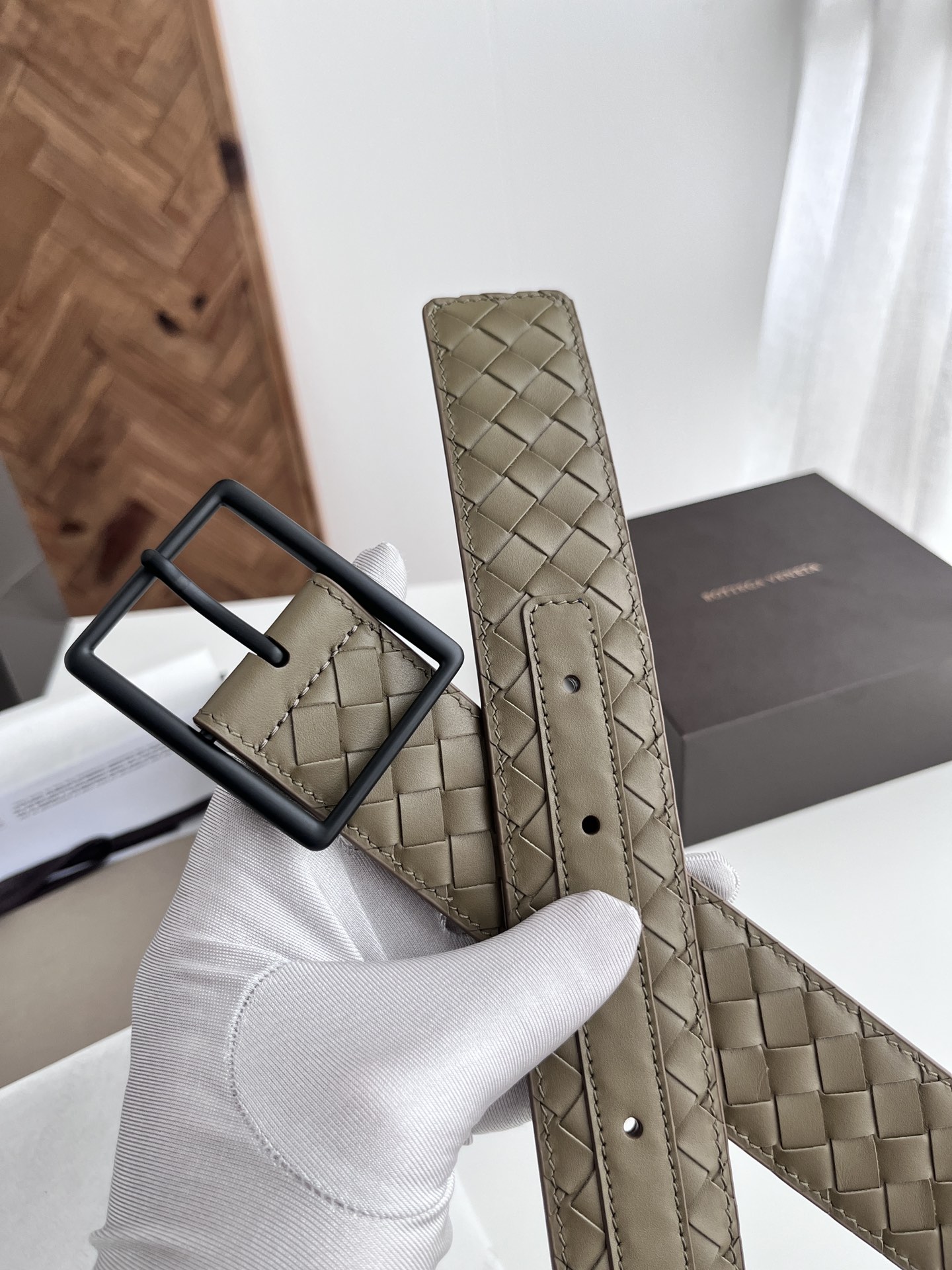 BV top-quality 2024 new wide men's belt, handcrafted with small checkered intrecciato piccolo braided Italian calfskin, paired with vacuum gun-colored pin buckle holes. Newly designed belt width 4.0cm. Color: military green