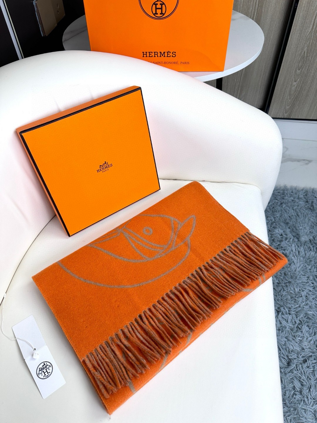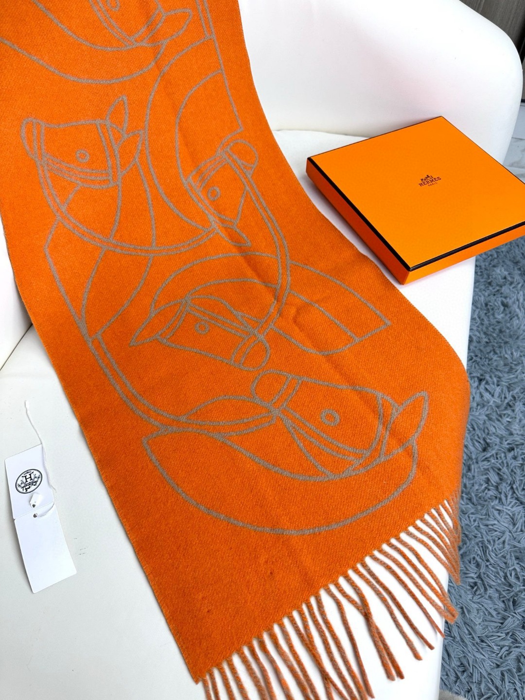 This new Hermes scarf features a delicate color-blocking jacquard weaving, presenting the Entrelacs Equestres horse head pattern designed by Geoff McFetridge. The size is 40*195CM