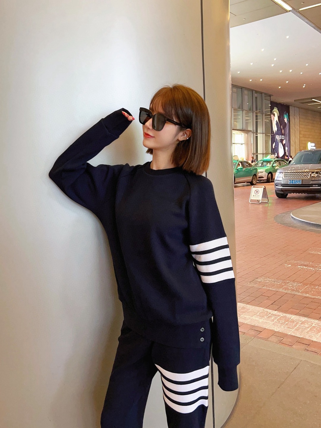 The effect of the model wearing it THOM BROWNE TB's new Waffle round-neck puller hoodie