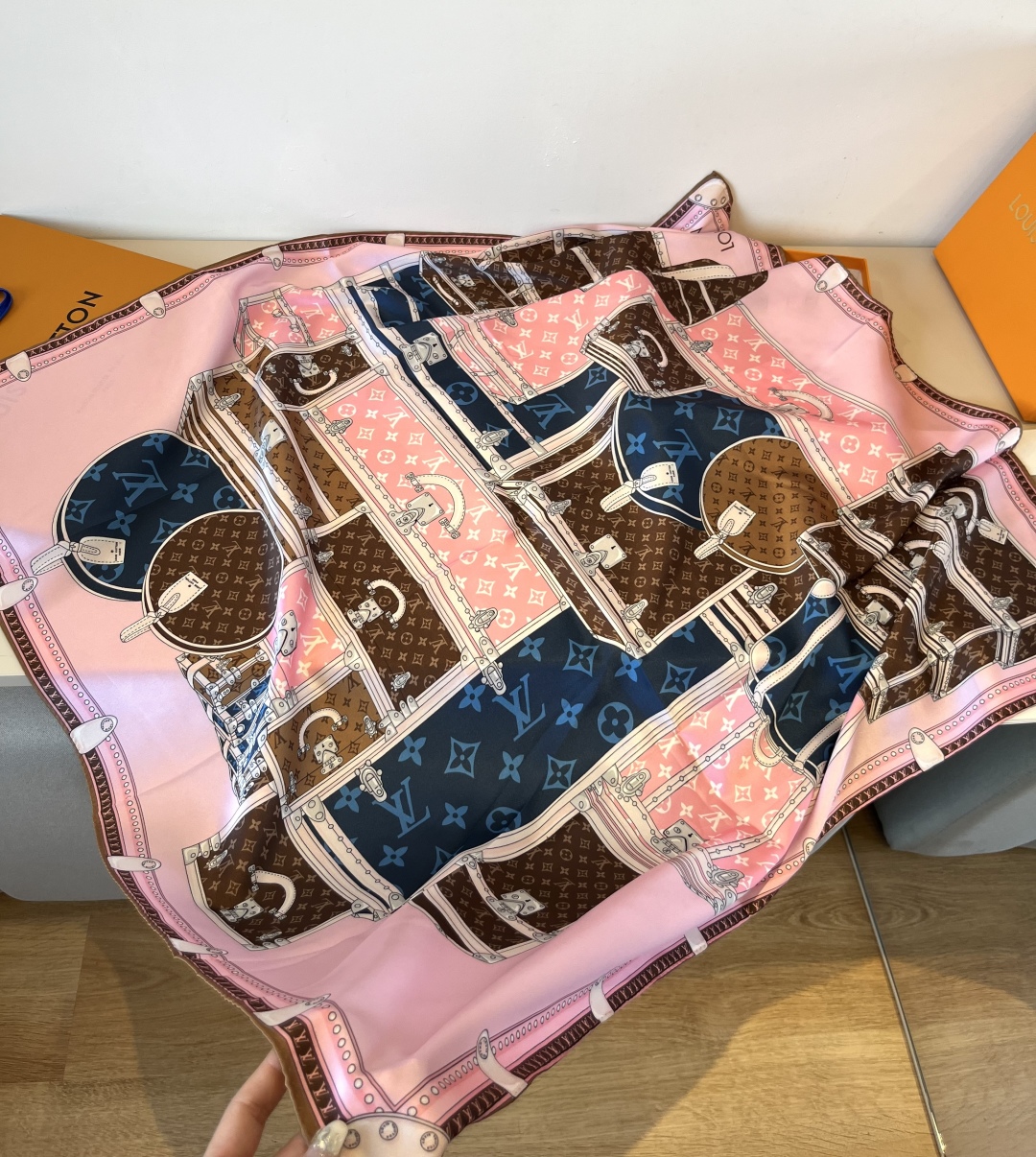 The Let's Go 90 handkerchief, relying on the silk-screen printing technique, depicts hard cases, studs, metal corner patterns and LV letters of various sizes with colorful strokes, highlighting Louis Vuitton's travel heritage. Paired with contrasting color silhouettes and hand-rolled edges, it has been newly added to the brand's accessory collection. 90 x 90 centimeters 100% silk